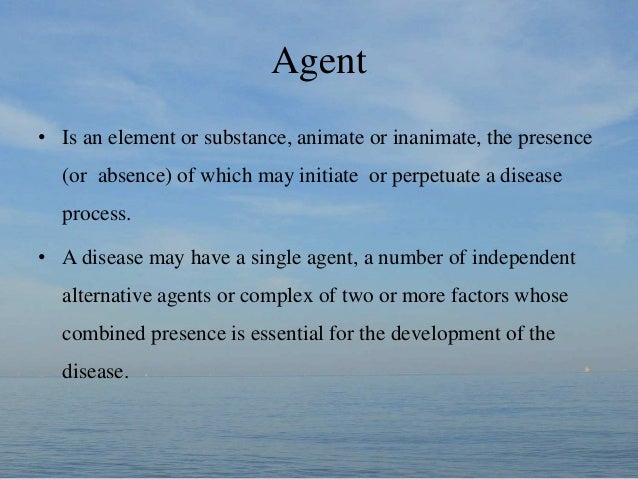 - 15. Agent • Is an element or substance, animate or inanimate, the presence (or absence) of which may initiate or perpetuate a disease process. • A disease may have a single agent, a number of independent alternative agents or complex of two or more factors whose combined presence is essential for the development of the disease.