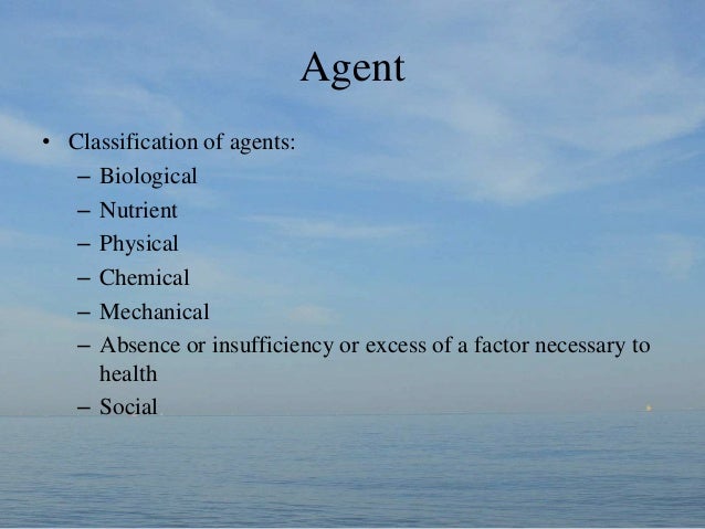 - 16. Agent • Classification of agents: – Biological – Nutrient – Physical – Chemical – Mechanical – Absence or insufficiency or excess of a factor necessary to health – Social