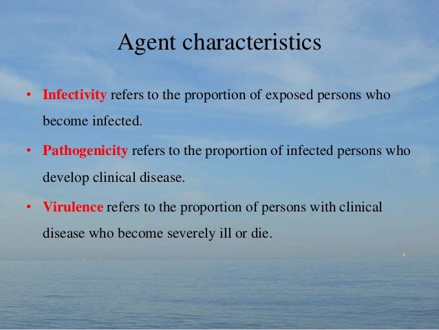 - 17. Agent characteristics • Infectivity refers to the proportion of exposed persons who become infected. • Pathogenicity refers to the proportion of infected persons who develop clinical disease. • Virulence refers to the proportion of persons with clinical disease who become severely ill or die.