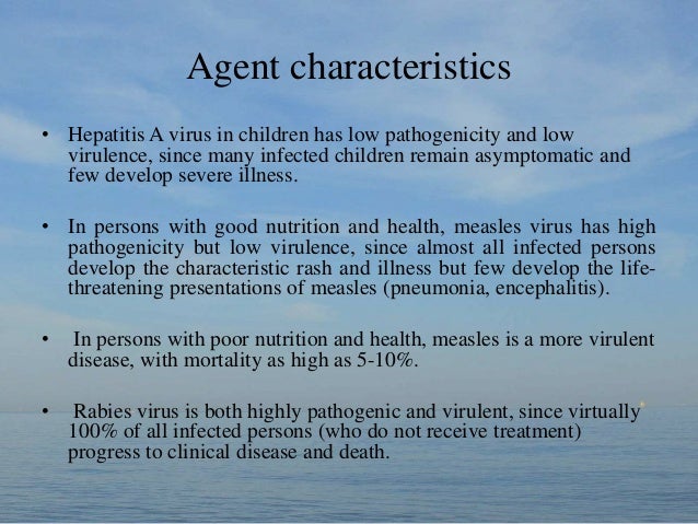 - 18. Agent characteristics • Hepatitis A virus in children has low pathogenicity and low virulence, since many infected children remain asymptomatic and few develop severe illness. • In persons with good nutrition and health, measles virus has high pathogenicity but low virulence, since almost all infected persons develop the characteristic rash and illness but few develop the life- threatening presentations of measles (pneumonia, encephalitis). • In persons with poor nutrition and health, measles is a more virulent disease, with mortality as high as 5-10%. • Rabies virus is both highly pathogenic and virulent, since virtually 100% of all infected persons (who do not receive treatment) progress to clinical disease and death.