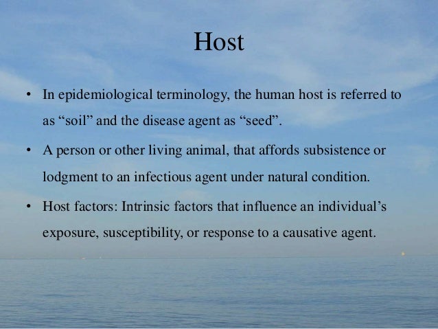 - 19. Host • In epidemiological terminology, the human host is referred to as “soil” and the disease agent as “seed”. • A person or other living animal, that affords subsistence or lodgment to an infectious agent under natural condition. • Host factors: Intrinsic factors that influence an individual’s exposure, susceptibility, or response to a causative agent.
