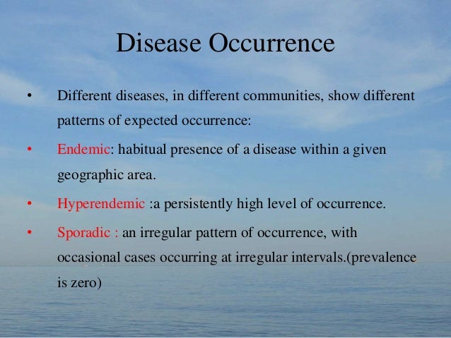 - 23. Disease Occurrence • Different diseases, in different communities, show different patterns of expected occurrence: • Endemic: habitual presence of a disease within a given geographic area. • Hyperendemic :a persistently high level of occurrence. • Sporadic : an irregular pattern of occurrence, with occasional cases occurring at irregular intervals.(prevalence is zero)