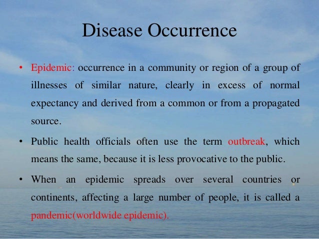 - 24. Disease Occurrence • Epidemic: occurrence in a community or region of a group of illnesses of similar nature, clearly in excess of normal expectancy and derived from a common or from a propagated source. • Public health officials often use the term outbreak, which means the same, because it is less provocative to the public. • When an epidemic spreads over several countries or continents, affecting a large number of people, it is called a pandemic(worldwide epidemic).