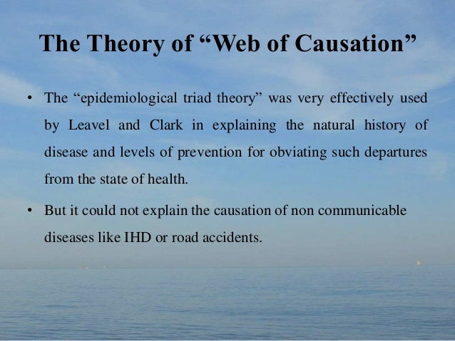 - 26. The Theory of “Web of Causation” • The “epidemiological triad theory” was very effectively used by Leavel and Clark in explaining the natural history of disease and levels of prevention for obviating such departures from the state of health. • But it could not explain the causation of non communicable diseases like IHD or road accidents.