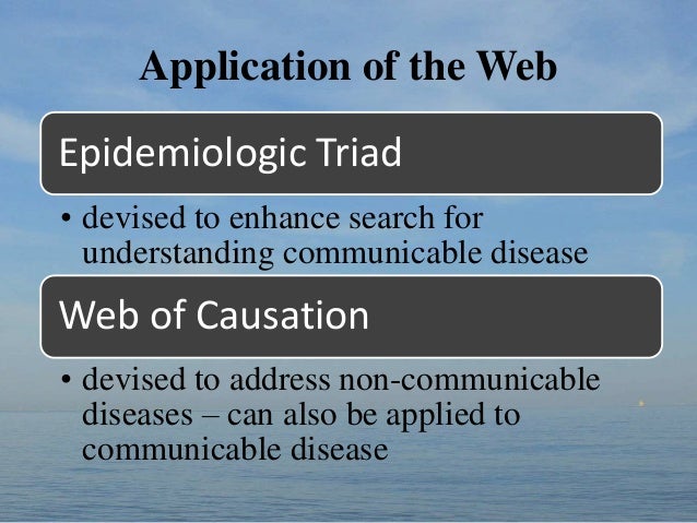 - 30. Application of the Web Epidemiologic Triad • devised to enhance search for understanding communicable disease Web of Causation • devised to address non-communicable diseases – can also be applied to communicable disease