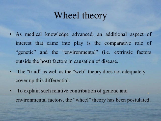 - 31. Wheel theory • As medical knowledge advanced, an additional aspect of interest that came into play is the comparative role of “genetic” and the “environmental” (i.e. extrinsic factors outside the host) factors in causation of disease. • The “triad” as well as the “web” theory does not adequately cover up this differential. • To explain such relative contribution of genetic and environmental factors, the “wheel” theory has been postulated.