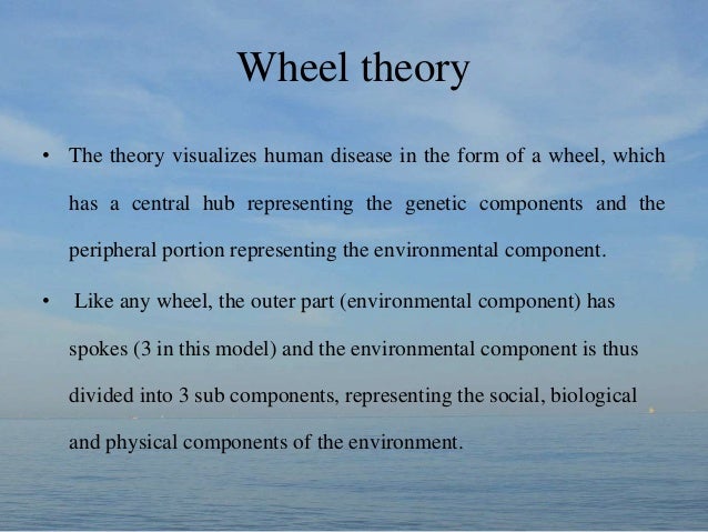 - 32. Wheel theory • The theory visualizes human disease in the form of a wheel, which has a central hub representing the genetic components and the peripheral portion representing the environmental component. • Like any wheel, the outer part (environmental component) has spokes (3 in this model) and the environmental component is thus divided into 3 sub components, representing the social, biological and physical components of the environment.