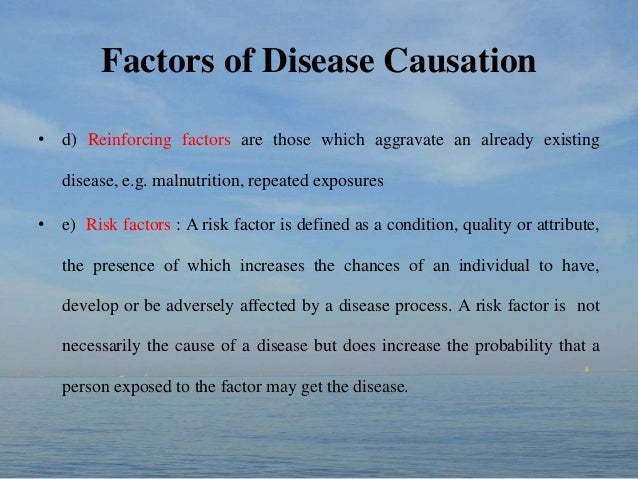 - 37. Factors of Disease Causation • d) Reinforcing factors are those which aggravate an already existing disease, e.g. malnutrition, repeated exposures • e) Risk factors : A risk factor is defined as a condition, quality or attribute, the presence of which increases the chances of an individual to have, develop or be adversely affected by a disease process. A risk factor is not necessarily the cause of a disease but does increase the probability that a person exposed to the factor may get the disease.