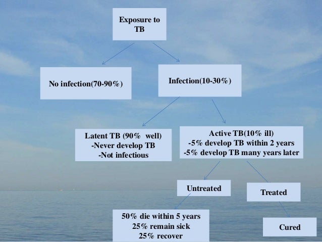 - 38. Exposure to TB Infection(10-30%)No infection(70-90%) Active TB(10% ill) -5% develop TB within 2 years -5% develop TB many years later Latent TB (90% well) -Never develop TB -Not infectious Treated Untreated Cured 50% die within 5 years 25% remain sick 25% recover
