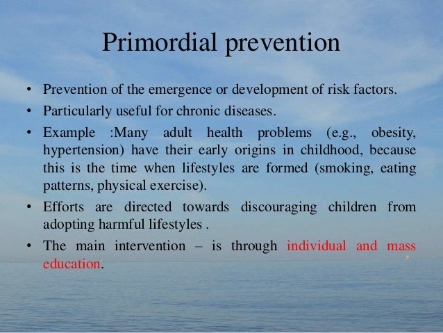 - 41. Primordial prevention • Prevention of the emergence or development of risk factors. • Particularly useful for chronic diseases. • Example :Many adult health problems (e.g., obesity, hypertension) have their early origins in childhood, because this is the time when lifestyles are formed (smoking, eating patterns, physical exercise). • Efforts are directed towards discouraging children from adopting harmful lifestyles . • The main intervention – is through individual and mass education.
