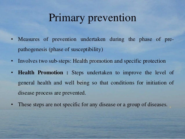 - 42. Primary prevention • Measures of prevention undertaken during the phase of pre- pathogenesis (phase of susceptibility) • Involves two sub-steps: Health promotion and specific protection • Health Promotion : Steps undertaken to improve the level of general health and well being so that conditions for initiation of disease process are prevented. • These steps are not specific for any disease or a group of diseases.