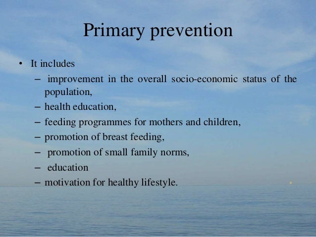 - 43. Primary prevention • It includes – improvement in the overall socio-economic status of the population, – health education, – feeding programmes for mothers and children, – promotion of breast feeding, – promotion of small family norms, – education – motivation for healthy lifestyle.
