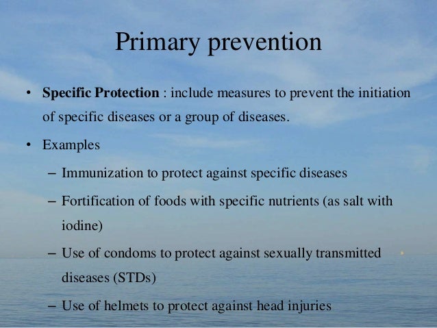 - 44. Primary prevention • Specific Protection : include measures to prevent the initiation of specific diseases or a group of diseases. • Examples – Immunization to protect against specific diseases – Fortification of foods with specific nutrients (as salt with iodine) – Use of condoms to protect against sexually transmitted diseases (STDs) – Use of helmets to protect against head injuries