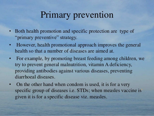 - 45. Primary prevention • Both health promotion and specific protection are type of “primary preventive” strategy. • However, health promotional approach improves the general health so that a number of diseases are aimed at. • For example, by promoting breast feeding among children, we try to prevent general malnutrition, vitamin A deficiency, providing antibodies against various diseases, preventing diarrhoeal diseases. • On the other hand when condom is used, it is for a very specific group of diseases i.e. STDs; when measles vaccine is given it is for a specific disease viz. measles.