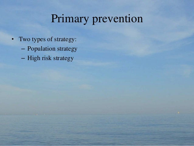 - 46. Primary prevention • Two types of strategy: – Population strategy – High risk strategy