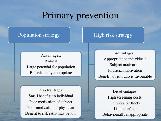 - 47. Primary prevention Population strategy Advantages: Radical Large potential for population Behaviourally appropriate Disadvantages: Small benefits to individual Poor motivation of subject Poor motivation of physician Benefit to risk ratio may be low High risk strategy Advantages : Appropriate to individuals Subject motivation Physician motivation Benefit to risk ratio is favourable Disadvantages: High screening costs. Temporary effects Limited effect Behaviourally inappropriate