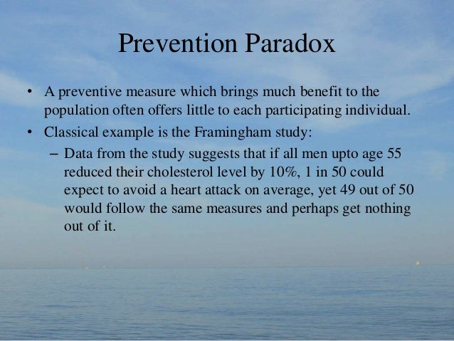 - 48. Prevention Paradox • A preventive measure which brings much benefit to the population often offers little to each participating individual. • Classical example is the Framingham study: – Data from the study suggests that if all men upto age 55 reduced their cholesterol level by 10%, 1 in 50 could expect to avoid a heart attack on average, yet 49 out of 50 would follow the same measures and perhaps get nothing out of it.