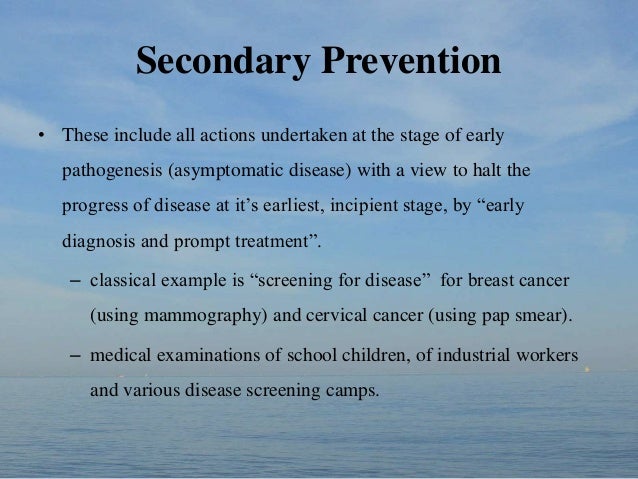 - 49. Secondary Prevention • These include all actions undertaken at the stage of early pathogenesis (asymptomatic disease) with a view to halt the progress of disease at it’s earliest, incipient stage, by “early diagnosis and prompt treatment”. – classical example is “screening for disease” for breast cancer (using mammography) and cervical cancer (using pap smear). – medical examinations of school children, of industrial workers and various disease screening camps.