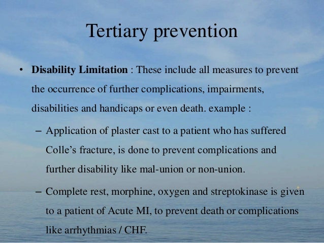 - 51. Tertiary prevention • Disability Limitation : These include all measures to prevent the occurrence of further complications, impairments, disabilities and handicaps or even death. example : – Application of plaster cast to a patient who has suffered Colle’s fracture, is done to prevent complications and further disability like mal-union or non-union. – Complete rest, morphine, oxygen and streptokinase is given to a patient of Acute MI, to prevent death or complications like arrhythmias / CHF.