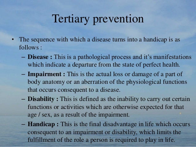 - 52. Tertiary prevention • The sequence with which a disease turns into a handicap is as follows : – Disease : This is a pathological process and it’s manifestations which indicate a departure from the state of perfect health. – Impairment : This is the actual loss or damage of a part of body anatomy or an aberration of the physiological functions that occurs consequent to a disease. – Disability : This is defined as the inability to carry out certain functions or activities which are otherwise expected for that age / sex, as a result of the impairment. – Handicap : This is the final disadvantage in life which occurs consequent to an impairment or disability, which limits the fulfillment of the role a person is required to play in life.