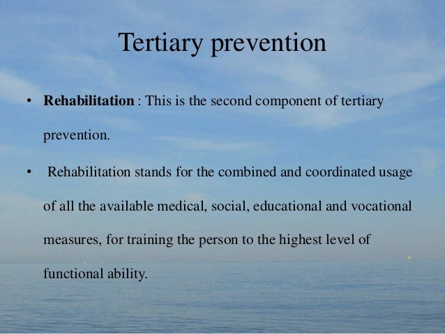 - 53. Tertiary prevention • Rehabilitation : This is the second component of tertiary prevention. • Rehabilitation stands for the combined and coordinated usage of all the available medical, social, educational and vocational measures, for training the person to the highest level of functional ability.