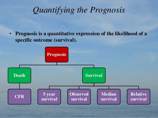 - 56. Quantifying the Prognosis • Prognosis is a quantitative expression of the likelihood of a specific outcome (survival). Prognosis Death CFR Survival 5 year survival Observed survival Median survival Relative survival
