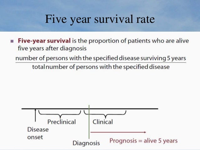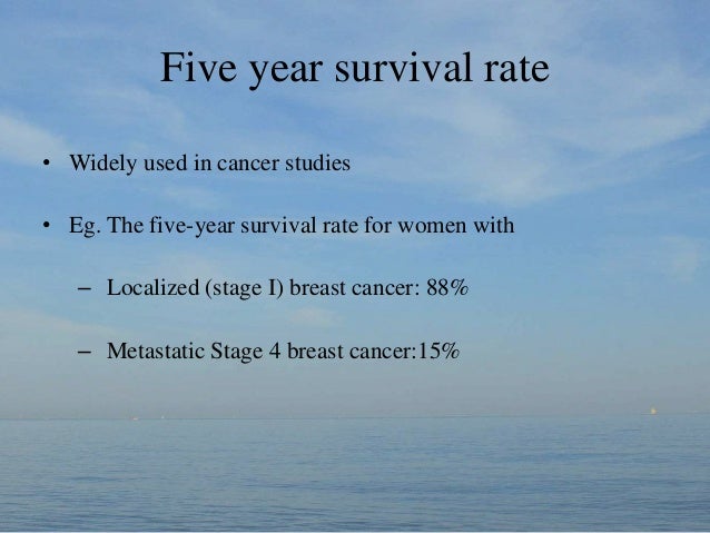 - 59. Five year survival rate • Widely used in cancer studies • Eg. The five-year survival rate for women with – Localized (stage I) breast cancer: 88% – Metastatic Stage 4 breast cancer:15%